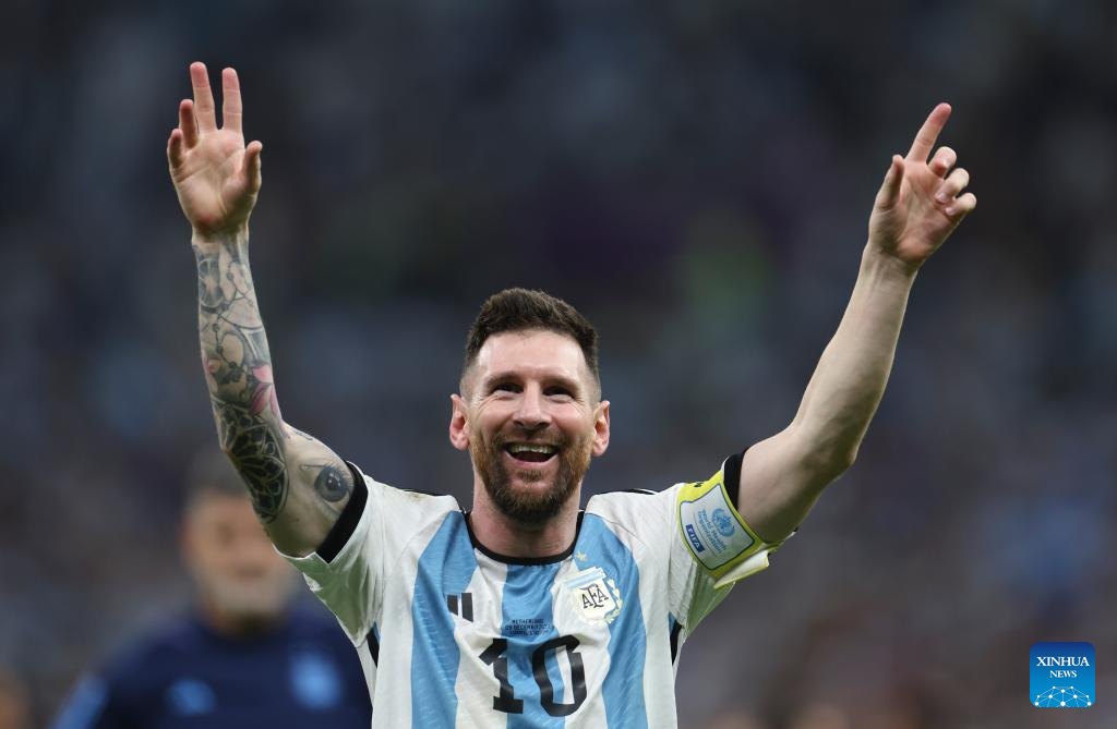 Lionel Messi of Argentina celebrates after the Quarterfinal between the Netherlands and Argentina of the 2022 FIFA World Cup at Lusail Stadium in Lusail, Qatar, Dec. 9, 2022. (Xinhua/Cao Can)