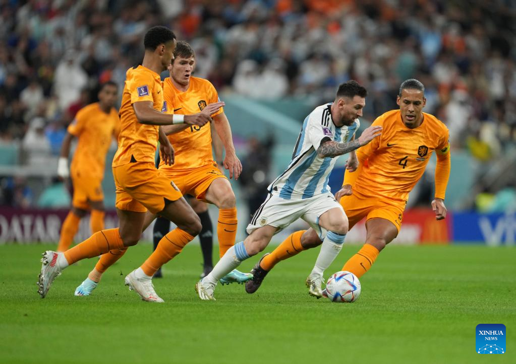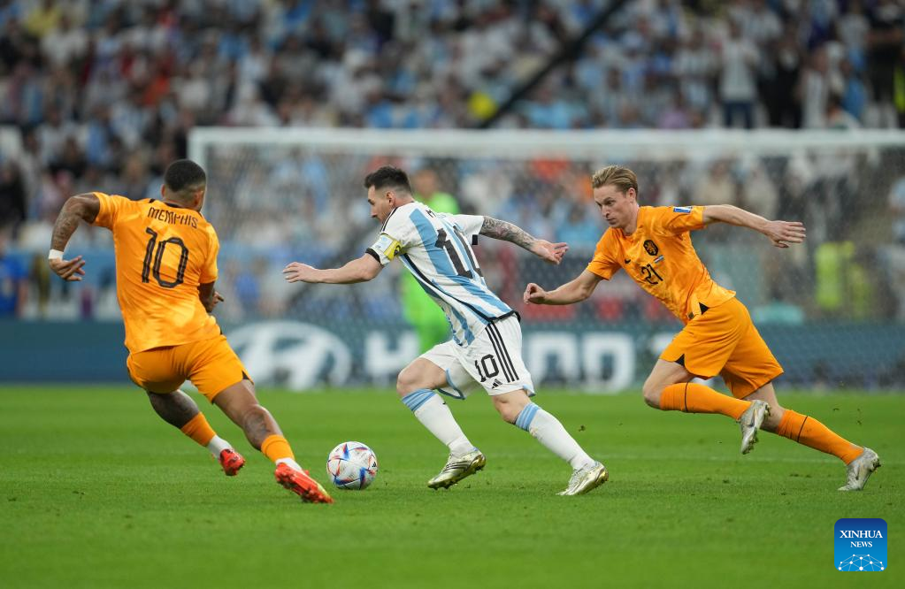 Lionel Messi (C) of Argentina competes during the Quarterfinal between the Netherlands and Argentina of the 2022 FIFA World Cup at Lusail Stadium in Lusail, Qatar, Dec. 9, 2022. (Xinhua/Zheng Huansong)
