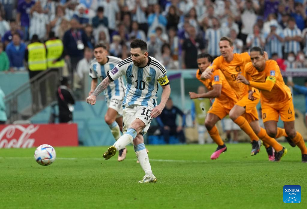 Lionel Messi (2nd L) of Argentina scores a penalty goal during the Quarterfinal between the Netherlands and Argentina of the 2022 FIFA World Cup at Lusail Stadium in Lusail, Qatar, Dec. 9, 2022. (Xinhua/Zheng Huansong)