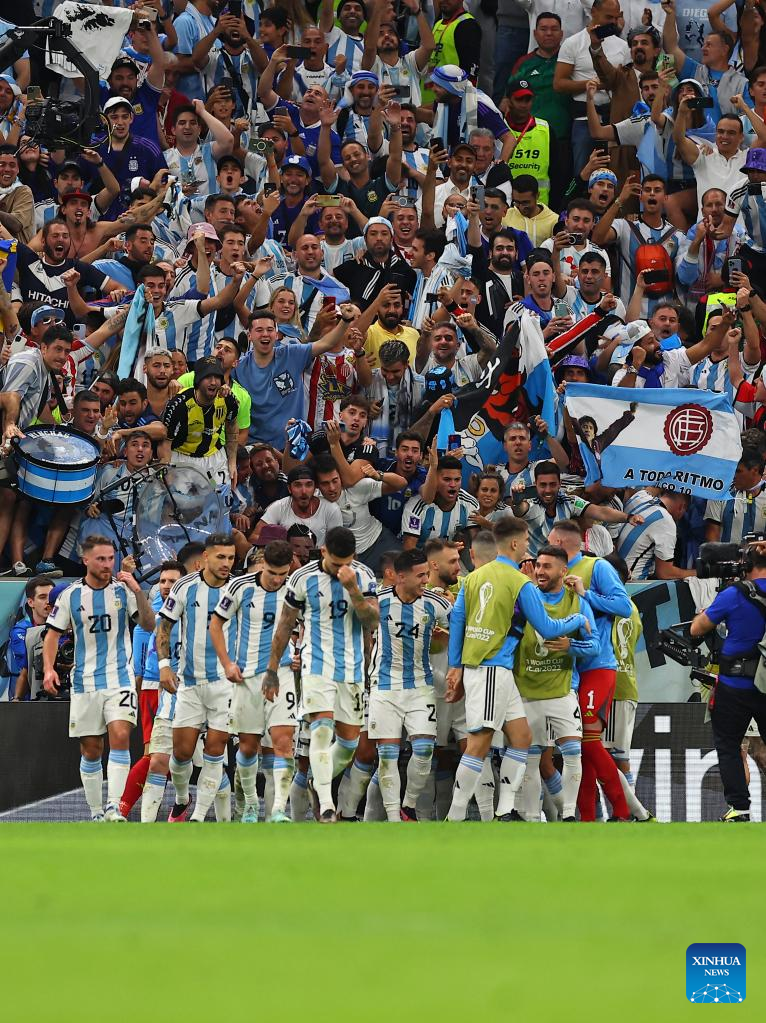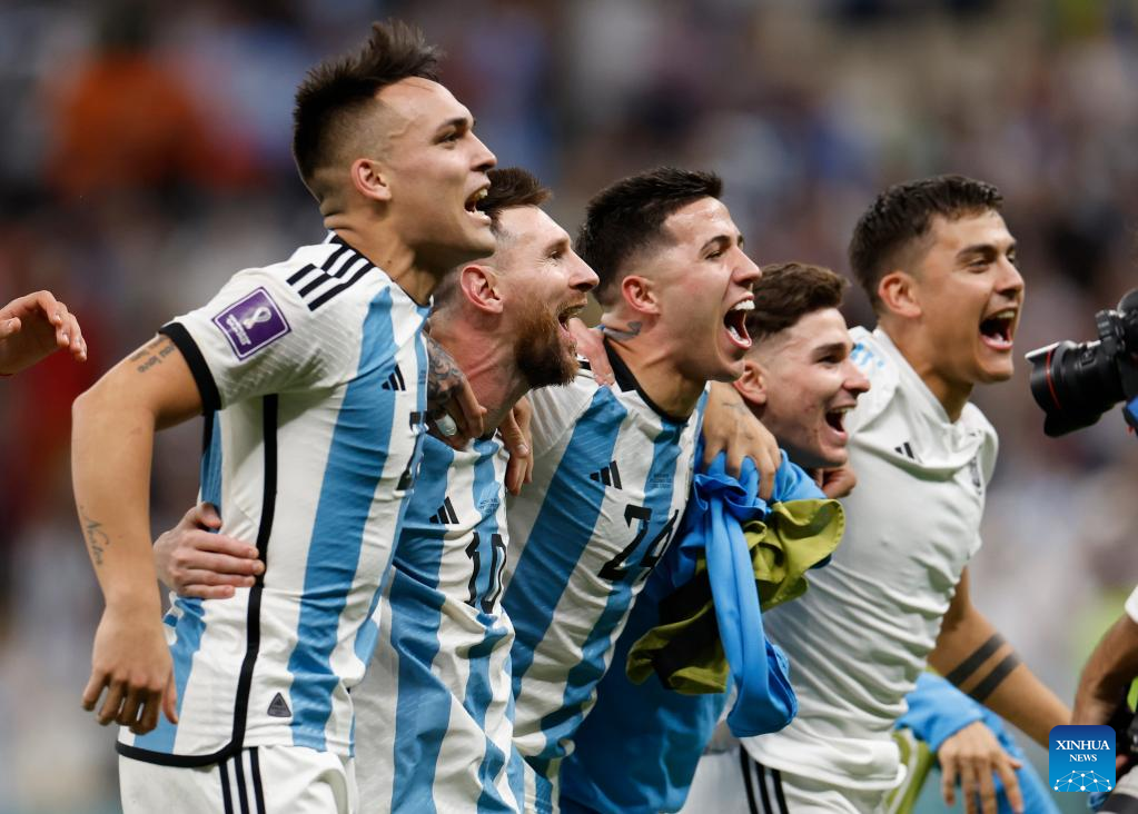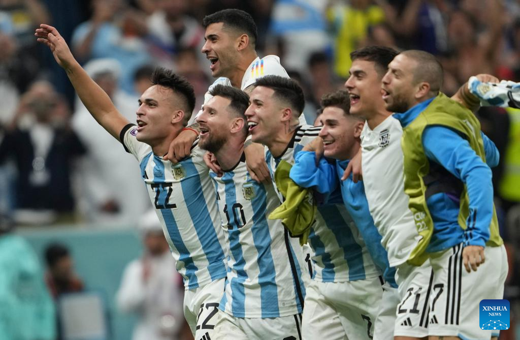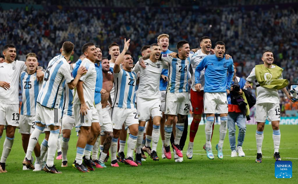 Players of Argentina celebrate after winning the Quarterfinal between the Netherlands and Argentina of the 2022 FIFA World Cup at Lusail Stadium in Lusail, Qatar, Dec. 9, 2022. (Xinhua/Zheng Huansong)