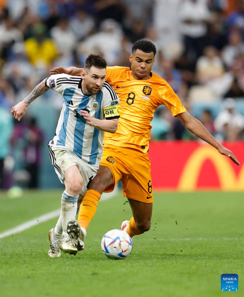 Lionel Messi (L) of Argentina vies with Cody Gakpo of the Netherlands during the Quarterfinal between the Netherlands and Argentina of the 2022 FIFA World Cup at Lusail Stadium in Lusail, Qatar, Dec. 9, 2022. (Xinhua/Wang Lili)