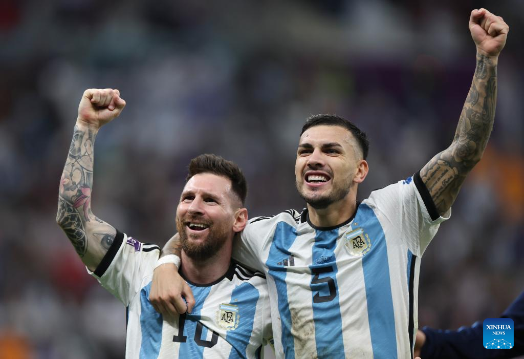 Lionel Messi (L) of Argentina celebrates with teammate Leandro Paredes after the Quarterfinal between the Netherlands and Argentina of the 2022 FIFA World Cup at Lusail Stadium in Lusail, Qatar, Dec. 9, 2022. (Xinhua/Cao Can)