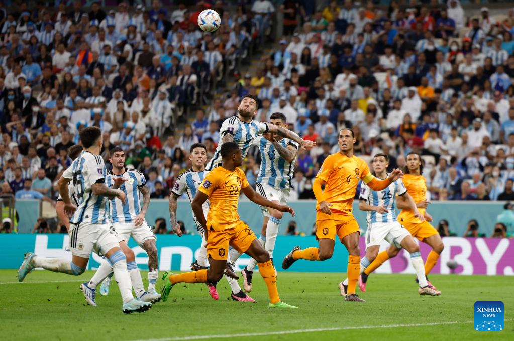 Nicolas Otamendi (top L) of Argentina heads the ball during the Quarterfinal between the Netherlands and Argentina of the 2022 FIFA World Cup at Lusail Stadium in Lusail, Qatar, Dec. 9, 2022. (Xinhua/Wang Lili)