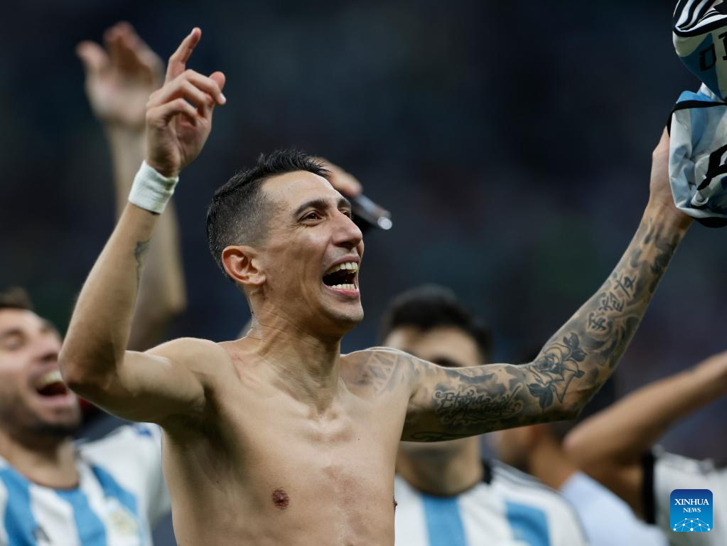 Angel di Maria of Argentina celebrates after the Quarterfinal between the Netherlands and Argentina of the 2022 FIFA World Cup at Lusail Stadium in Lusail, Qatar, Dec. 9, 2022. (Xinhua/Wang Lili)
