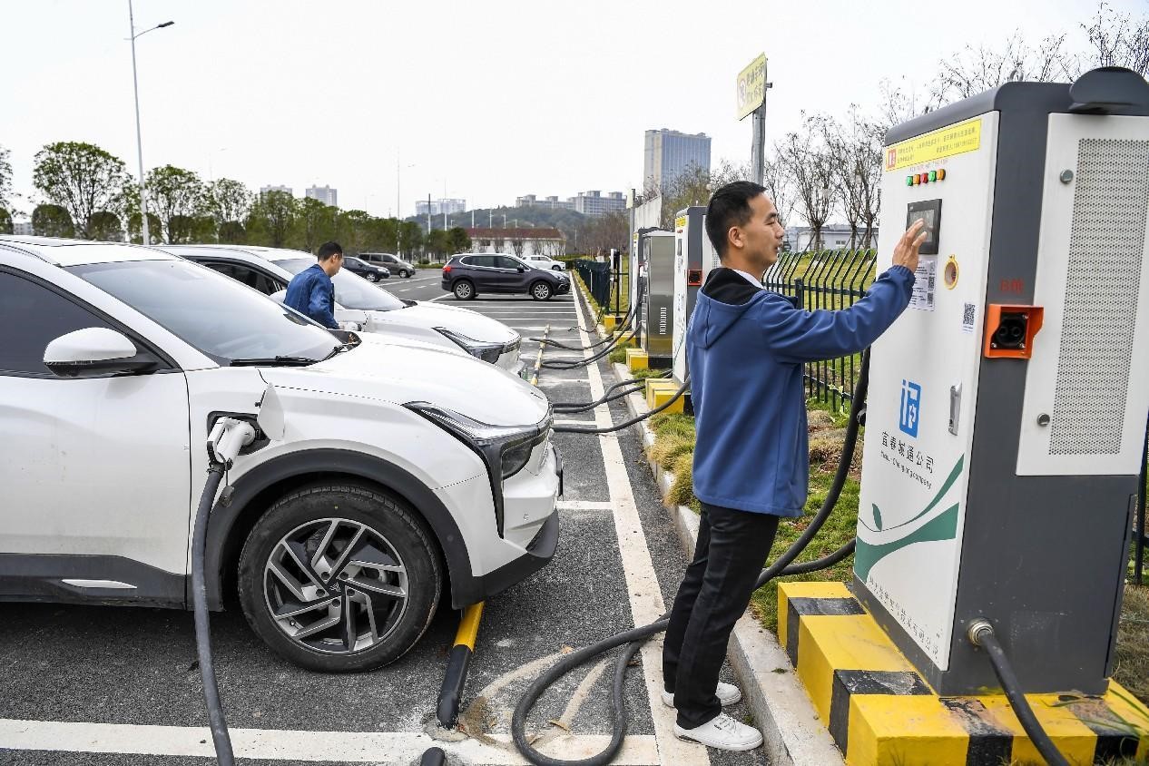 A man charges an electric vehicle in a parking lot in Fengxin county, Yichun, east China's Jiangxi province, Nov. 21, 2022. (People's Daily Online/Zhou Liang)