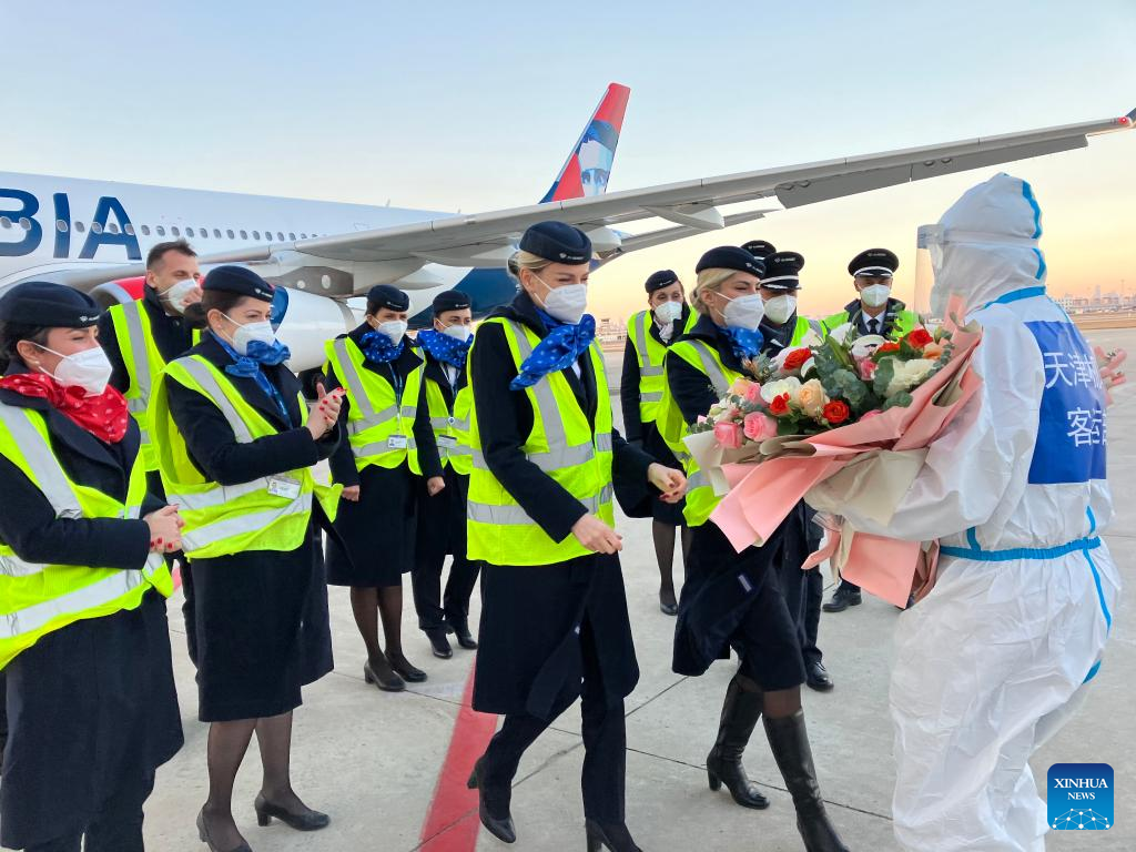 An airport staff member presents flower bouquets to crew members of flight JU702 at Tianjin Binhai International Airport in north China's Tianjin, Dec. 10, 2022. The flight carrying about 170 passengers landed at Tianjin Binhai International Airport on Saturday, marking the official opening of the direct flight between Serbia's Belgrade and north China's Tianjin city.