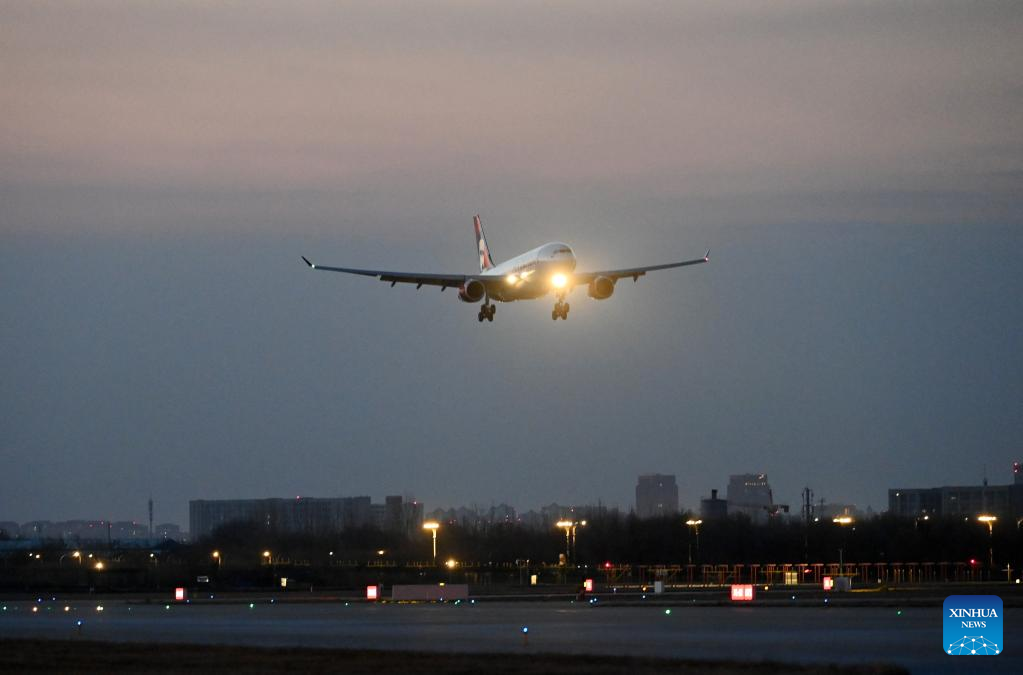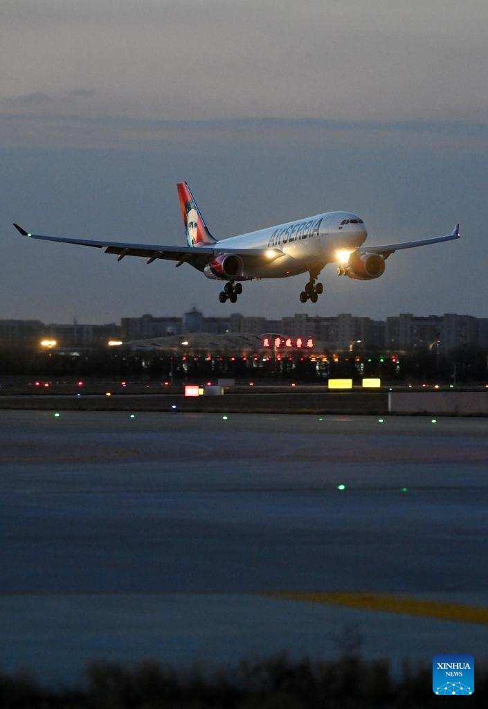 Flight JU702 prepares for landing at Tianjin Binhai International Airport in north China's Tianjin, Dec. 10, 2022. The flight carrying about 170 passengers landed at Tianjin Binhai International Airport on Saturday, marking the official opening of the direct flight between Serbia's Belgrade and north China's Tianjin city.