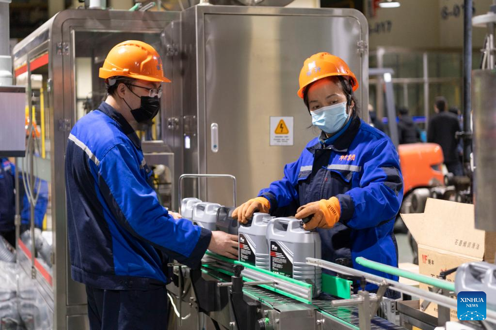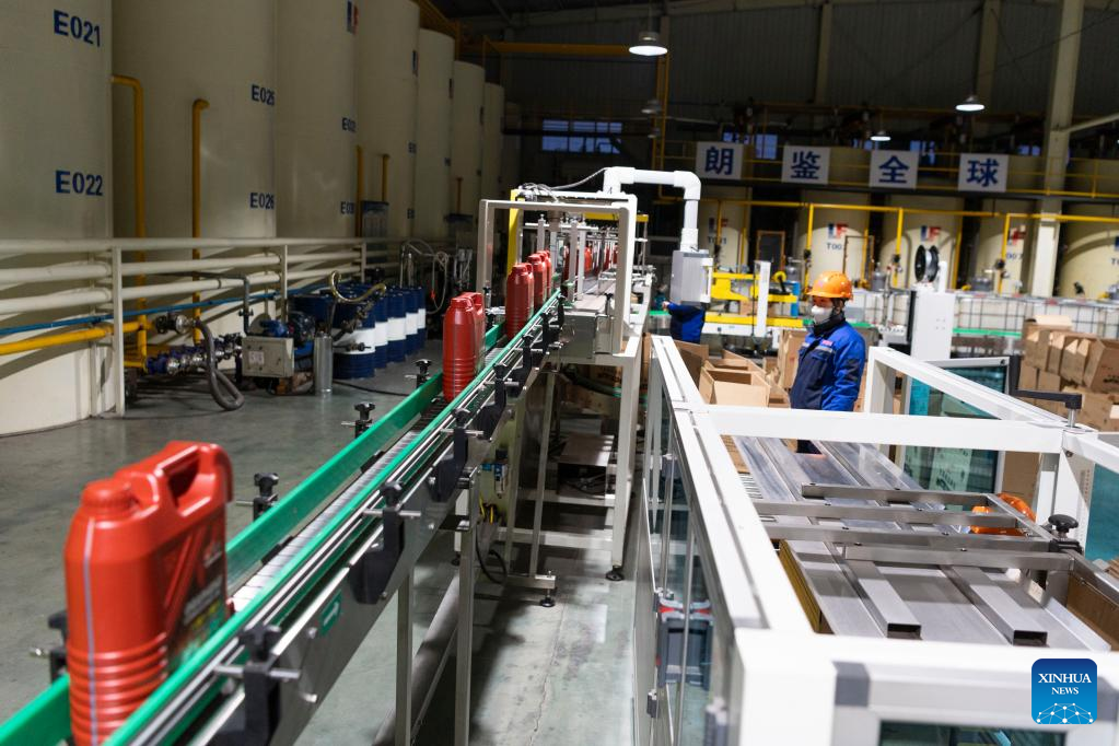 Employees produce graphene lubricating oil at a workshop of a company in Hegang City, northeast China's Heilongjiang Province, Dec. 8, 2022. In recent years, Hegang City has upgraded the exploitation of graphite resources and boosted the city's industrial transformation by developing graphite industry, promoting the local economic development.