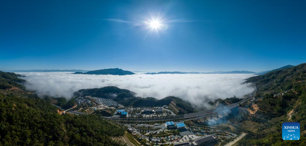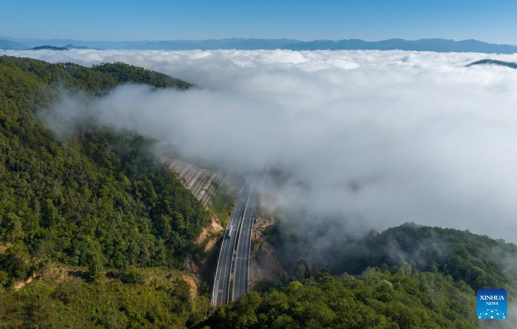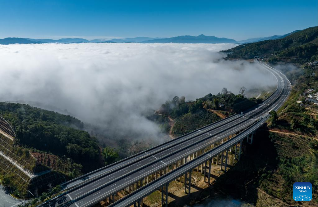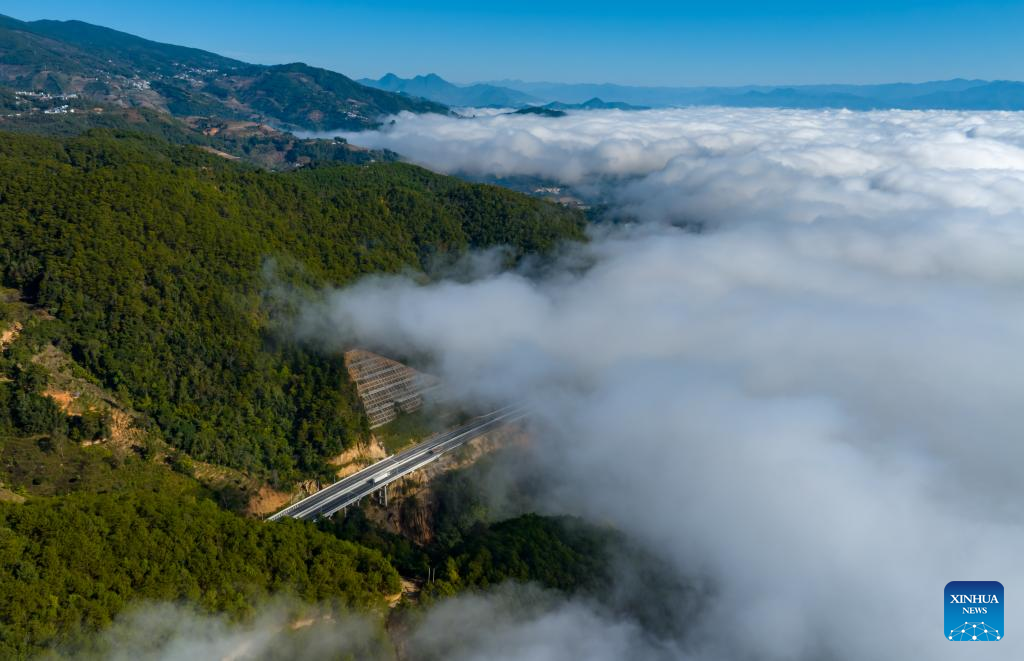 This aerial photo taken on Dec. 8, 2022 shows a highway amid sea of clouds in Lincang City of southwest China's Yunnan Province. (Xinhua/Jiang Wenyao)