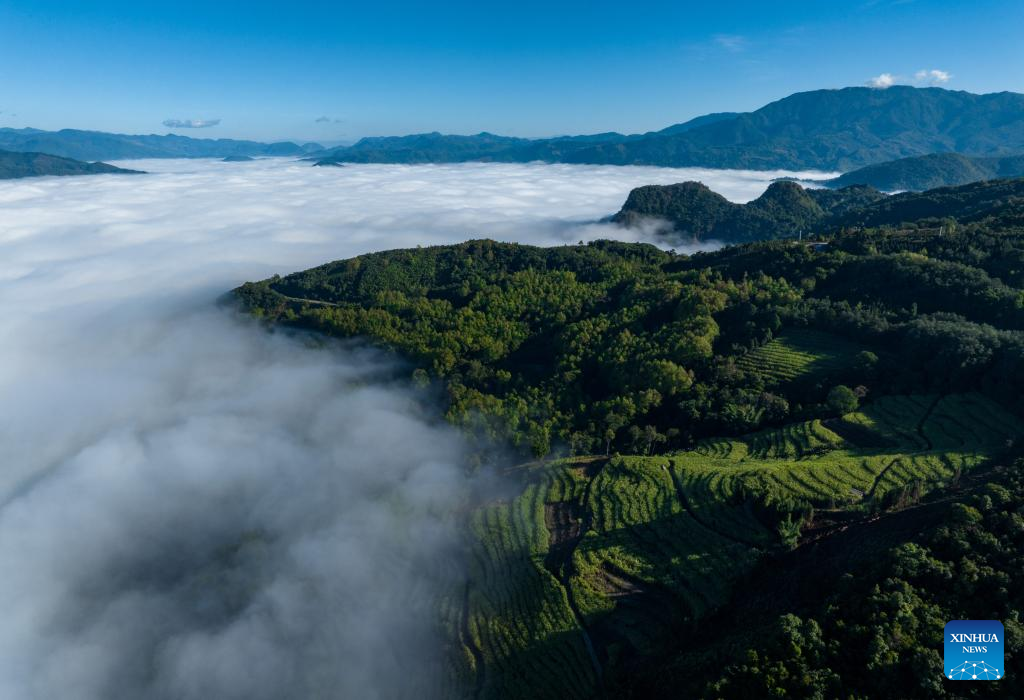 This aerial photo taken on Dec. 9, 2022 shows tea garden amid sea of clouds in Cangyuan Wa Autonomous County, Lincang City of southwest China's Yunnan Province. (Xinhua/Jiang Wenyao)