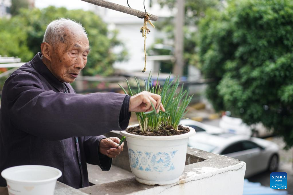 Gong Denian, a survivor of the Nanjing Massacre, picks scallions to prepare for lunch in Nanjing, east China's Jiangsu Province, April 29, 2022. (Xinhua/Ji Chunpeng)