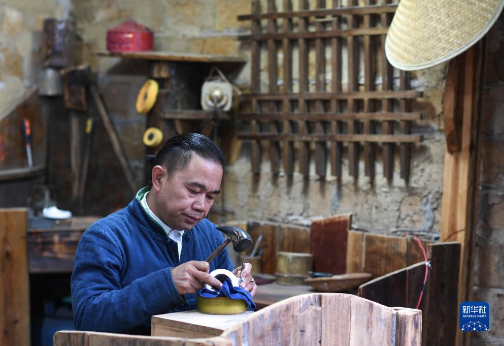 Wang Guochun, an inheritor of the silver jewelry making technique of the Miao ethnic group, makes a piece of silver jewelry in Kala village of Danzhai county, Qiandongnan Miao and Dong autonomous prefecture of southwest China's Guizhou Province, on Nov. 16, 2022. (Xinhua/Yang Wenbin)