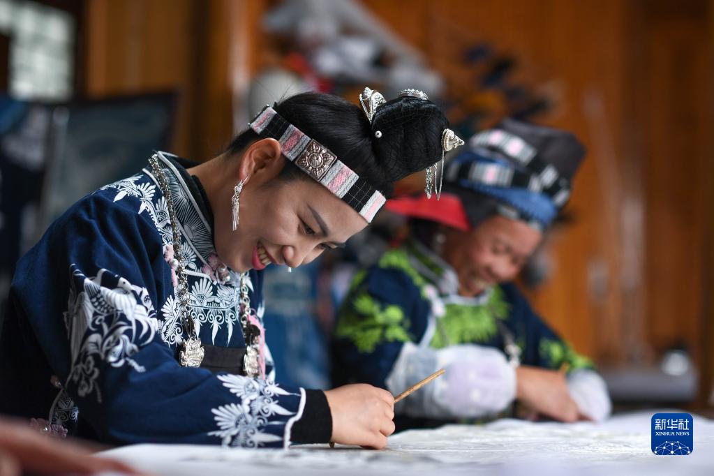 Zhang Yiping (left), an inheritor of a traditional wax dyeing technique, draws a wax painting in Kala village of Danzhai county, Qiandongnan Miao and Dong autonomous prefecture of Guizhou Province, on Nov. 16, 2022. (Xinhua/Yang Wenbin)