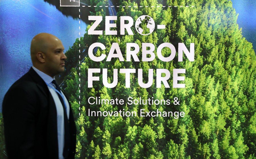 A participant walks past a board at the exhibition area of the 27th session of the Conference of the Parties (COP27) to the United Nations Framework Convention on Climate Change in Sharm El-Sheikh, Egypt, Nov. 10, 2022. (Xinhua/Sui Xiankai)