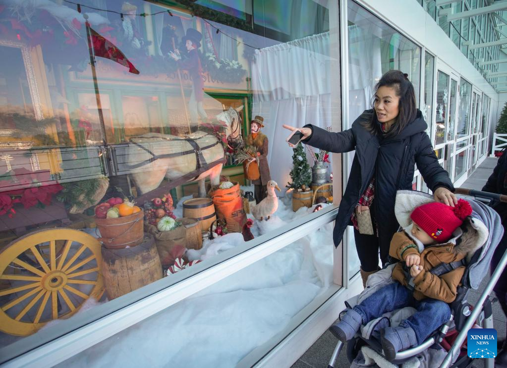 People look at vintage Christmas window displays at Canada Place in Vancouver, British Columbia, Canada, on Dec. 12, 2022. The vintage Christmas window displays are now for viewing here as part of the Christmas highlights in Vancouver. (Photo by Liang Sen/Xinhua)