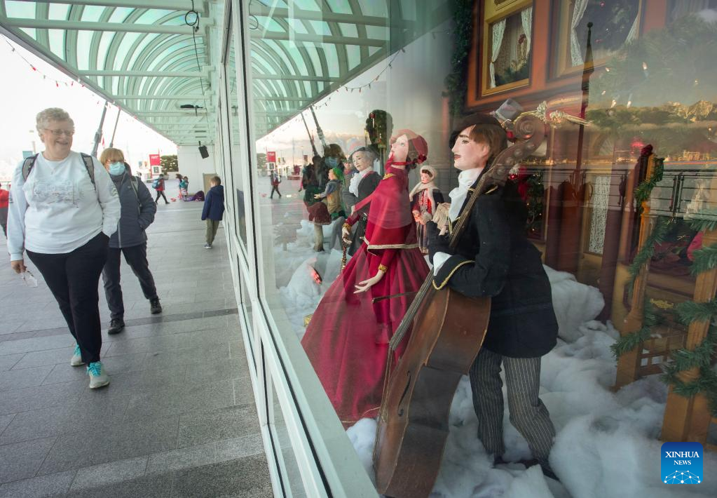 People look at vintage Christmas window displays at Canada Place in Vancouver, British Columbia, Canada, on Dec. 12, 2022. The vintage Christmas window displays are now for viewing here as part of the Christmas highlights in Vancouver. (Photo by Liang Sen/Xinhua)