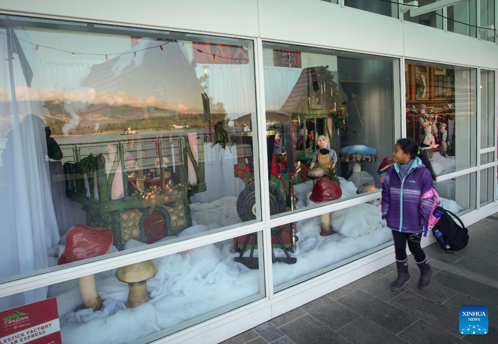 A girl looks at vintage Christmas window displays at Canada Place in Vancouver, British Columbia, Canada, on Dec. 12, 2022. The vintage Christmas window displays are now for viewing here as part of the Christmas highlights in Vancouver. (Photo by Liang Sen/Xinhua)