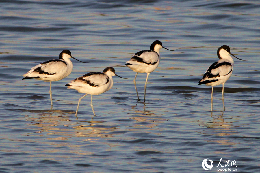 A flock of pied avocets forage on the wetland, Xiamen city, southeast China’s Fujian Province. (Photo/Chen Bo)