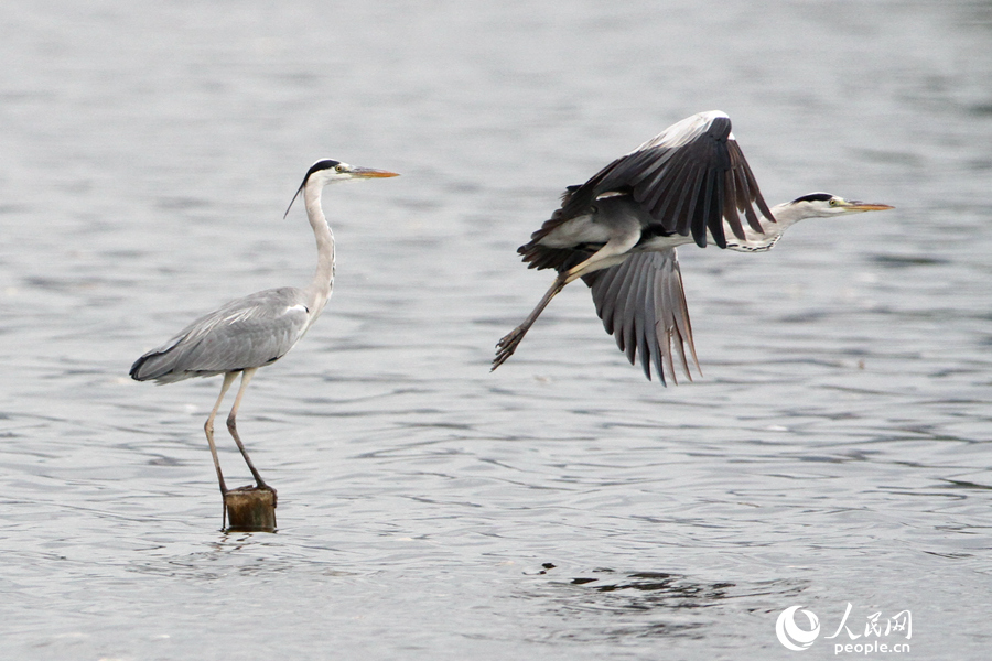 Two gray herons rest on the bank of Xinglin Bay, Xiamen city, southeast China’s Fujian Province. (Photo/Chen Bo)