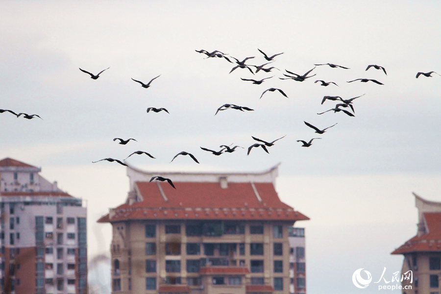 A flock of cormorants fly over Jimei district, Xiamen city, southeast China’s Fujian Province. (Photo/Chen Bo)