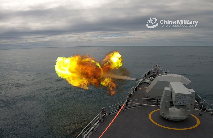 A guided-missile frigate attached to a frigate flotilla with the navy under the PLA Southern Theater Command fires its main gun against sea target during a maritime training exercise on November 21, 2022. (eng.chinamil.com.cn/Photo by Zhang Weifeng)