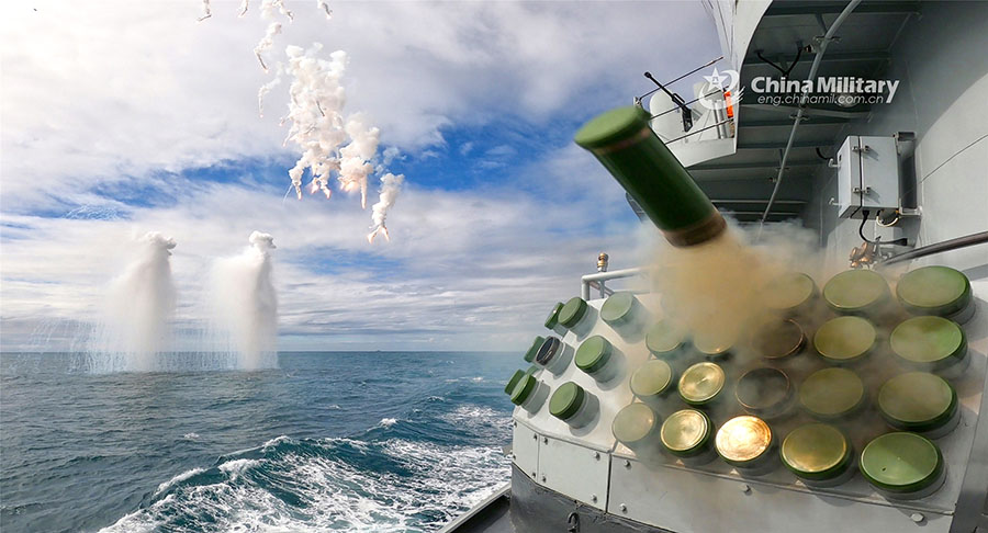 A guided-missile frigate attached to a frigate flotilla with the navy under the PLA Southern Theater Command launches decoys during a maritime training exercise on November 21, 2022. (eng.chinamil.com.cn/Photo by Zhang Weifeng)