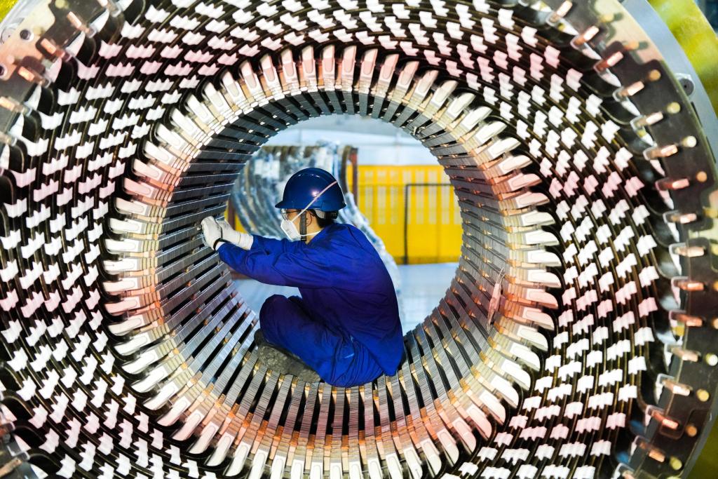 A worker works at a factory of Harbin Electric Machinery Company Ltd. of Harbin Electric Corporation in Harbin, northeast China's Heilongjiang Province, Sept. 3, 2022. (Xinhua/Wang Song)