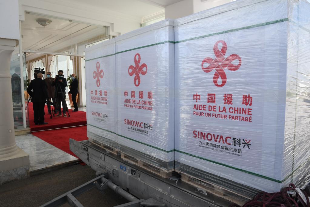 A batch of COVID-19 vaccines donated by China arrives at an airport in Tunis, Tunisia, Feb. 22, 2022. (Photo by Adel Ezzine/Xinhua)