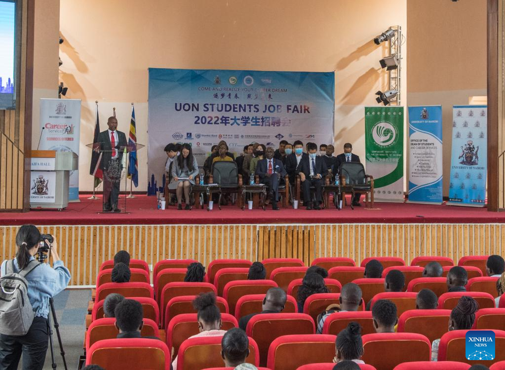 People attend a presentation during a job fair by Chinese companies in Nairobi, Kenya, on Dec. 13, 2022. Chinese companies kicked off a two-day job fair on Tuesday in the Kenyan capital of Nairobi, offering about 300 opportunities for Kenyan students. (Xinhua/Li Yahui)