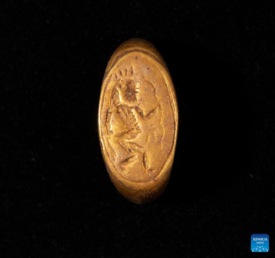 Undated photo shows an ancient gold ring discovered in the ancient city of Amarna, Minya Governorate, Egypt. An Egyptian-British archaeological mission discovered a collection of gold jewelry south of the capital Cairo, said the Egyptian Ministry of Tourism and Antiquities on Tuesday. "The find, discovered in the ancient city of Amarna, comprised three gold rings, one of which is decorated with a depiction of the ancient Egyptian Bes, god of fun, and the second is inscribed with a phrase in hieroglyphics that means a lady of the two lands," the ministry said in a statement. (Egyptian Ministry of Tourism and Antiquities/Handout via Xinhua)