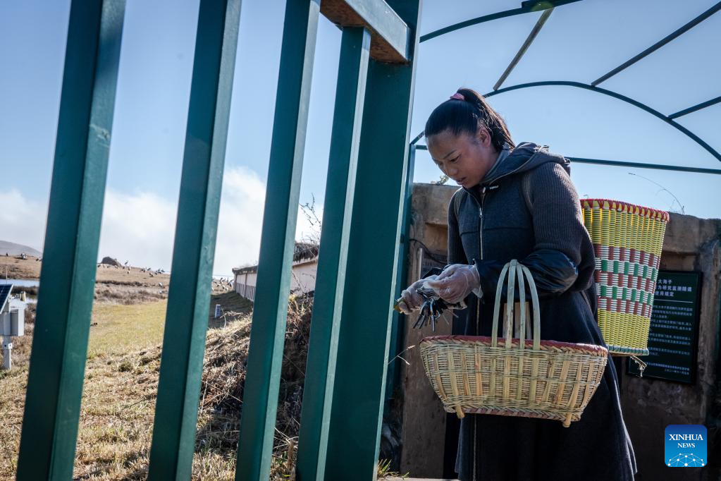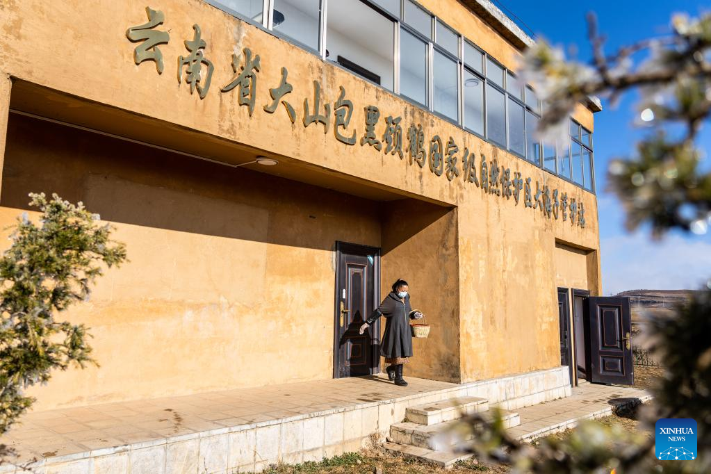Chen Guanghui prepares to feed black-necked cranes at Yunnan Dashanbao National Nature Reserve for Black-necked Cranes in Zhaotong, southwest China's Yunnan Province, Dec. 11, 2022. Yunnan Dashanbao National Nature Reserve for Black-necked Cranes, located in Zhaoyang District of Zhaotong City, is the most significant wintering habitat and transfer station for migratory black-necked cranes on the Yunnan-Guizhou Plateau.