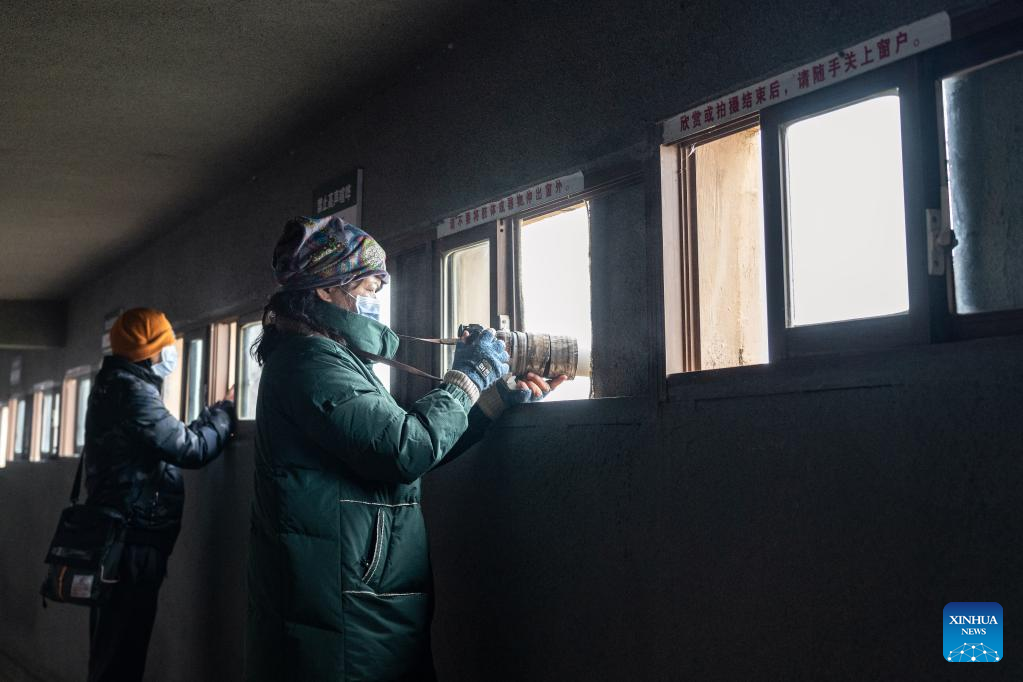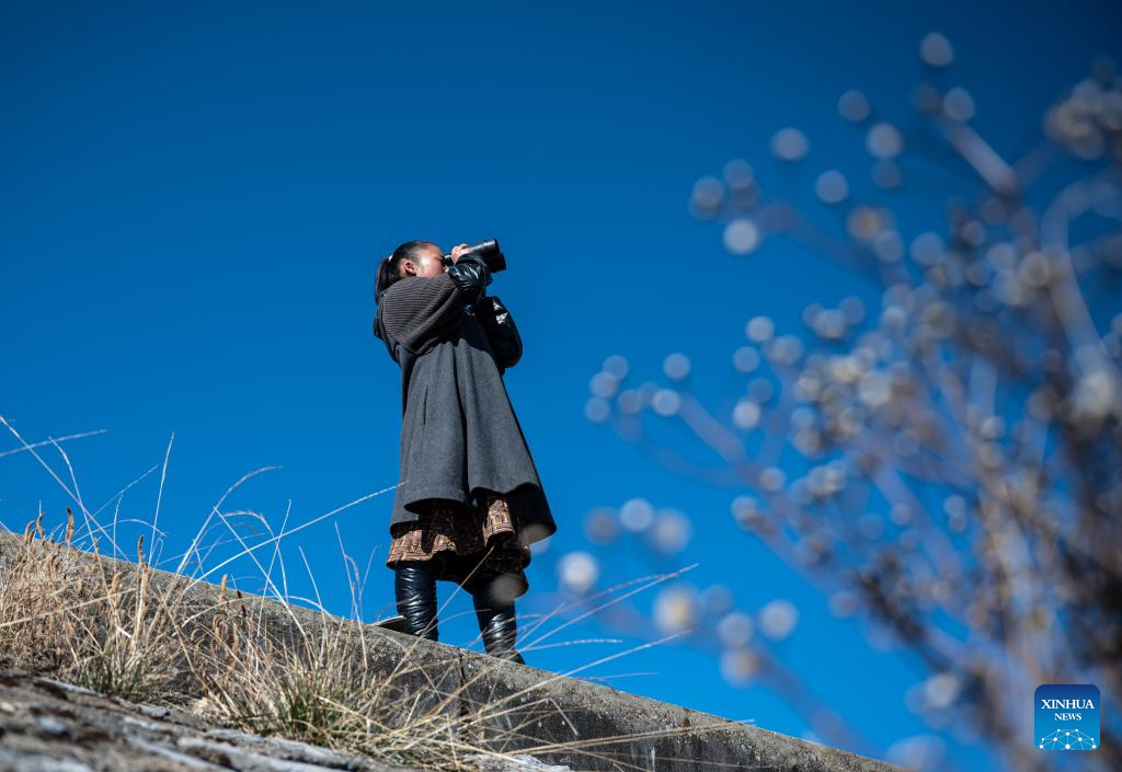 Chen Guanghui observes black-necked cranes at Yunnan Dashanbao National Nature Reserve for Black-necked Cranes in Zhaotong, southwest China's Yunnan Province, Dec. 11, 2022. Yunnan Dashanbao National Nature Reserve for Black-necked Cranes, located in Zhaoyang District of Zhaotong City, is the most significant wintering habitat and transfer station for migratory black-necked cranes on the Yunnan-Guizhou Plateau.