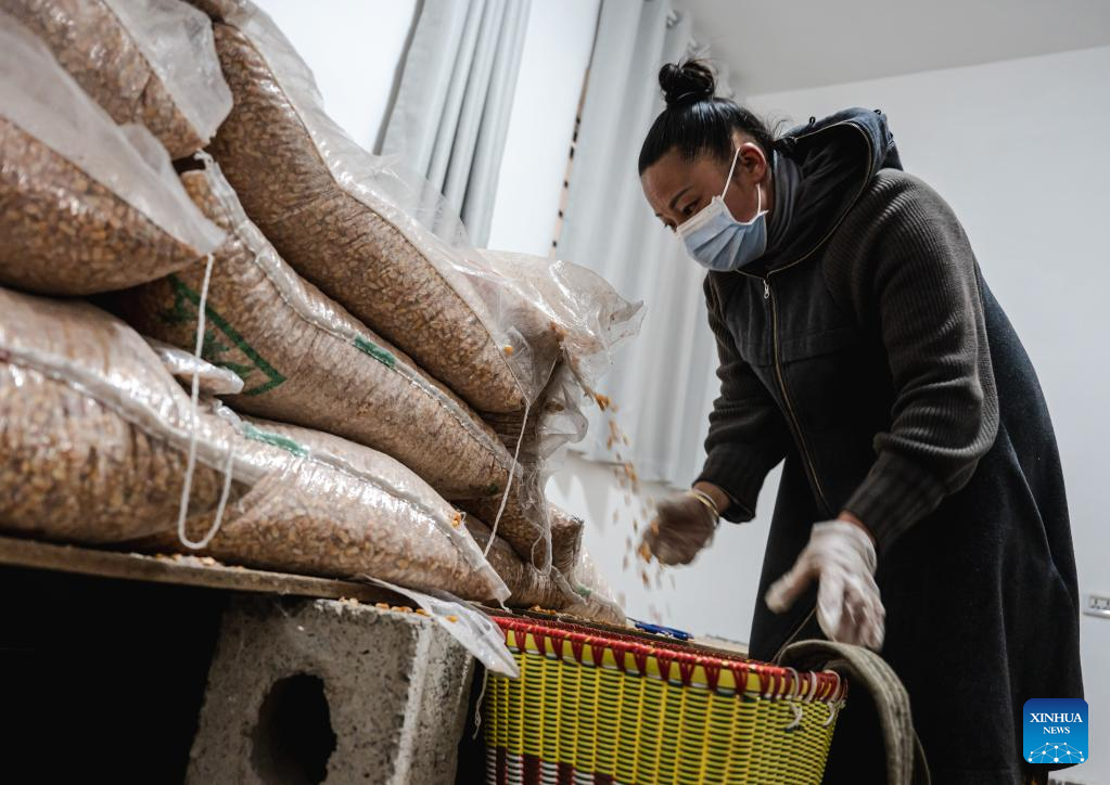 Chen Guanghui prepares to feed black-necked cranes at Yunnan Dashanbao National Nature Reserve for Black-necked Cranes in Zhaotong, southwest China's Yunnan Province, Dec. 10, 2022. Yunnan Dashanbao National Nature Reserve for Black-necked Cranes, located in Zhaoyang District of Zhaotong City, is the most significant wintering habitat and transfer station for migratory black-necked cranes on the Yunnan-Guizhou Plateau.