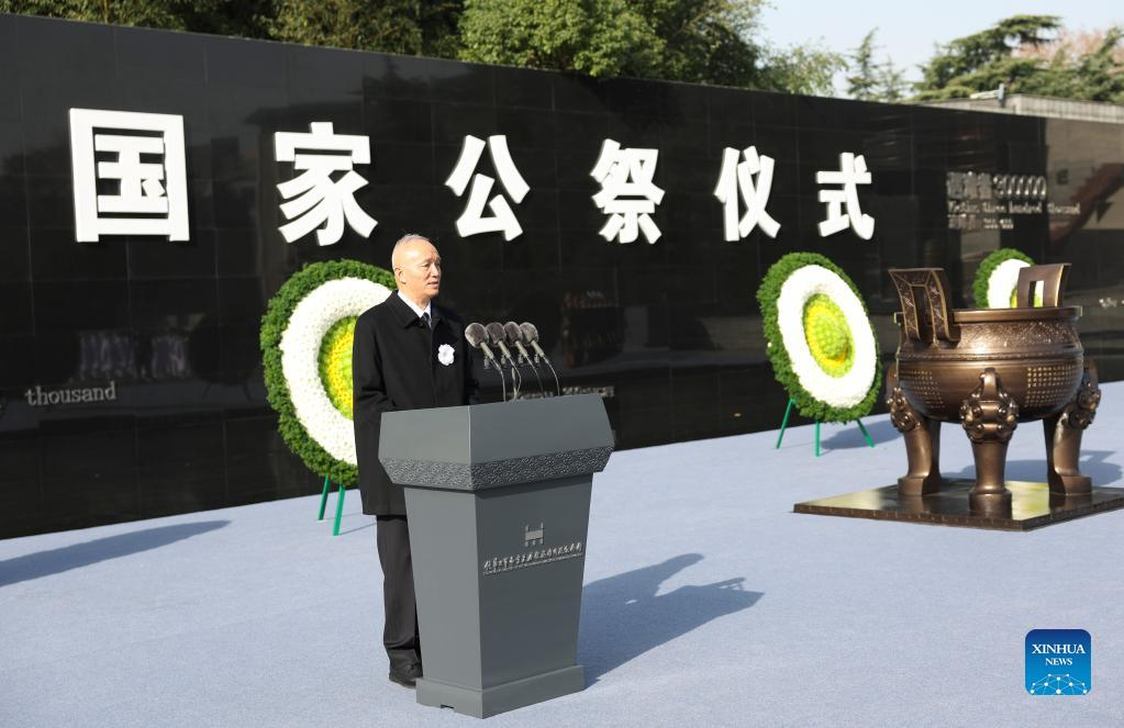 Cai Qi, a member of the Standing Committee of the Political Bureau of the CPC Central Committee and a member of the CPC Central Committee Secretariat, made the remarks at the ceremony, held in Nanjing in remembrance of the 300,000 victims who died in the Nanjing Massacre committed by Japanese invaders in 1937.
