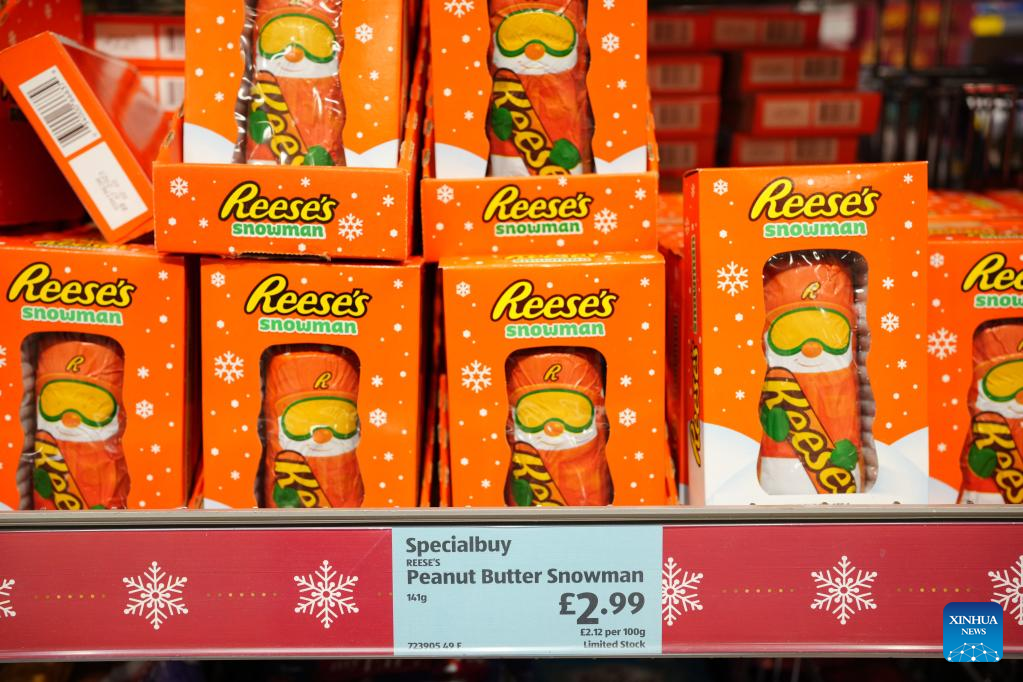 Discounted Christmas items are pictured in a shop in Manchester, Britain, Dec. 13, 2022. Soaring inflation has forced many households to reassess their spending for Christmas this year. (Photo by Jon Super/Xinhua)