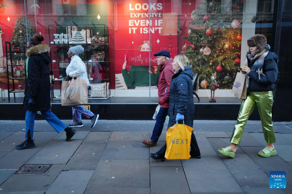 People walk past promotional signs in Manchester, Britain, Dec. 13, 2022. Soaring inflation has forced many households to reassess their spending for Christmas this year. (Photo by Jon Super/Xinhua)