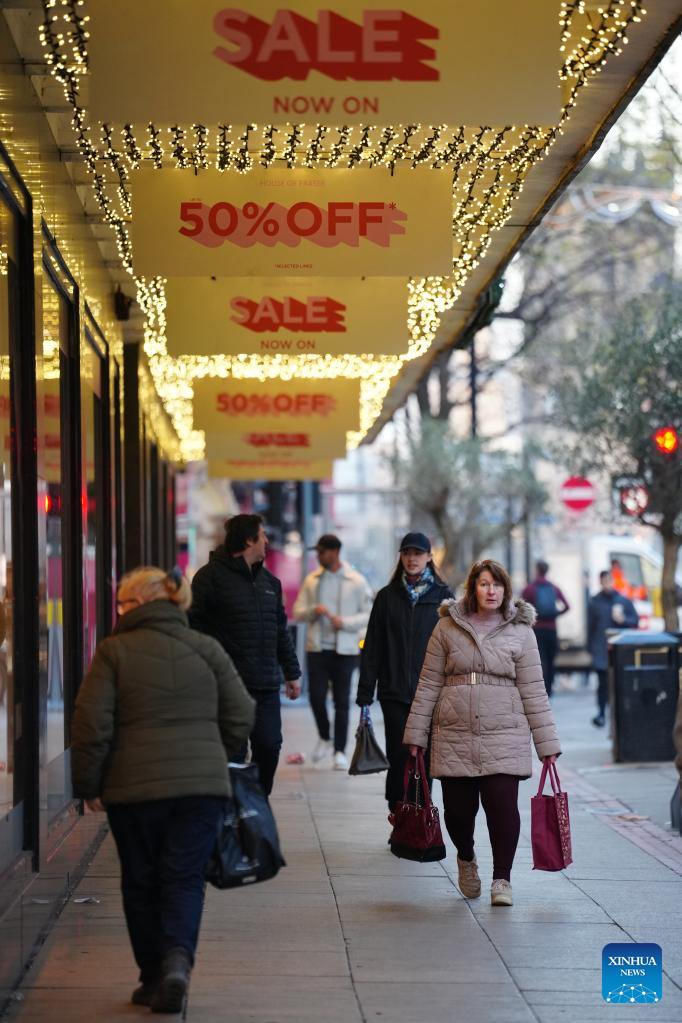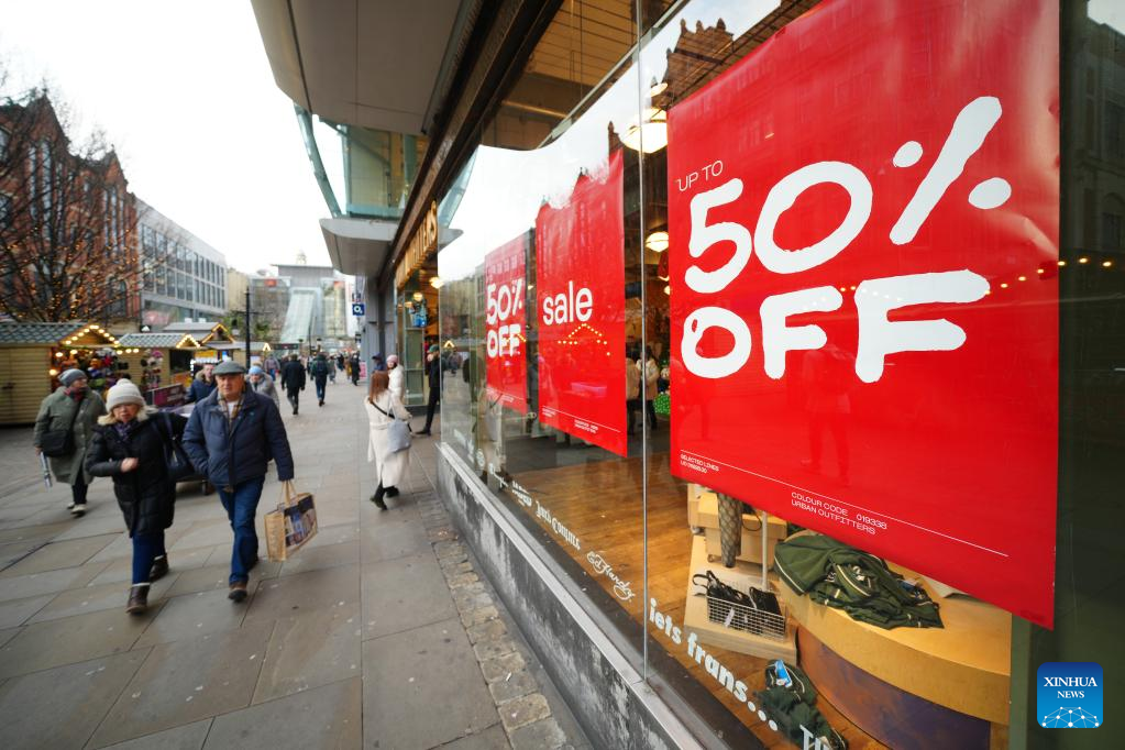 People walk past a promotional sign in Manchester, Britain, Dec. 13, 2022. Soaring inflation has forced many households to reassess their spending for Christmas this year. (Photo by Jon Super/Xinhua)