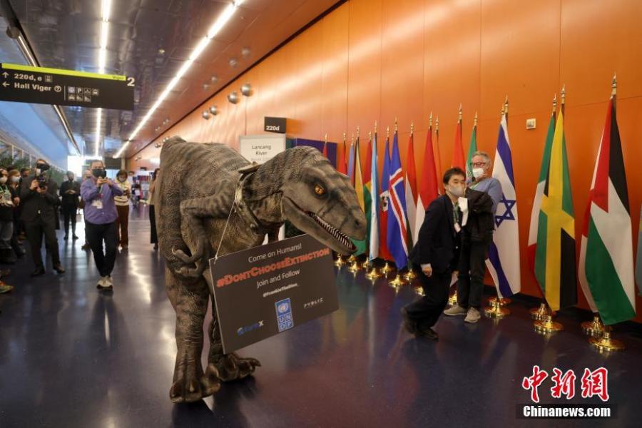 Frankie the Dinosaur, the United Nations Development Programme's “special guest,” makes an appearance at the United Nations Biodiversity Conference (COP15) in Montreal, Canada, Dec, 2022. (Photo: China News Service/Yu Ruidong)