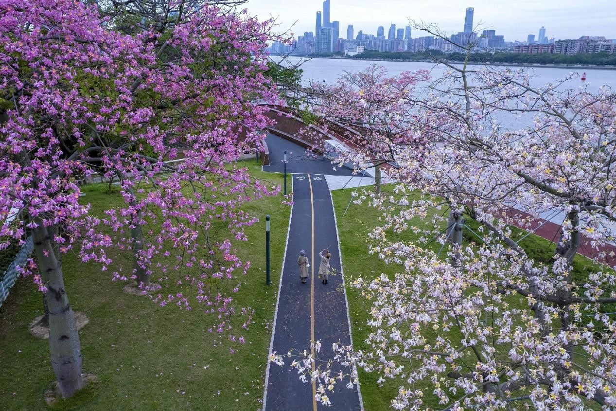 Floss silk trees blossom in a pocket park on the bank of the Pearl River in Haizhu district, Guangzhou, south China's Guangdong province, Dec. 2, 2022. (People's Daily Online/Lv Huadang)
