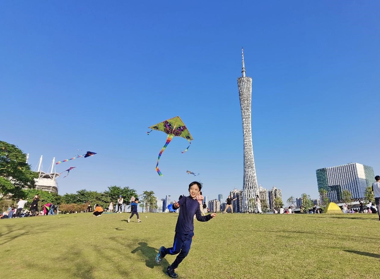 A boy flies a kite near the Canton Tower in Guangzhou, south China's Guangdong province, Apr. 3, 2022. (People's Daily Online/Wang Guorong)