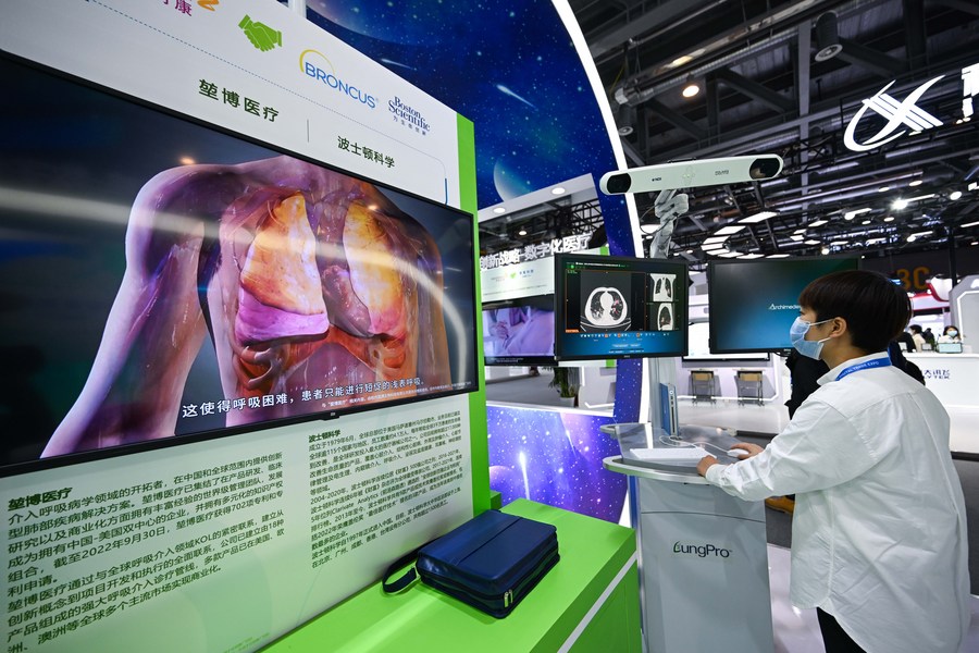 A staff member demonstrates a smart digital medical system during the first Global Digital Trade Expo in Hangzhou, east China's Zhejiang Province, Dec. 12, 2022. (Xinhua/Xu Yu)