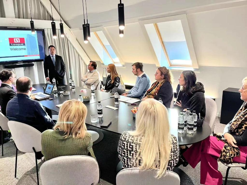 Chen Xiaojun, chairman of Nuntius Bonded Logistics Center Co., Ltd (Anhui), attends a meeting with clients in Belgium, Dec. 10, 2022.(Xinhua)