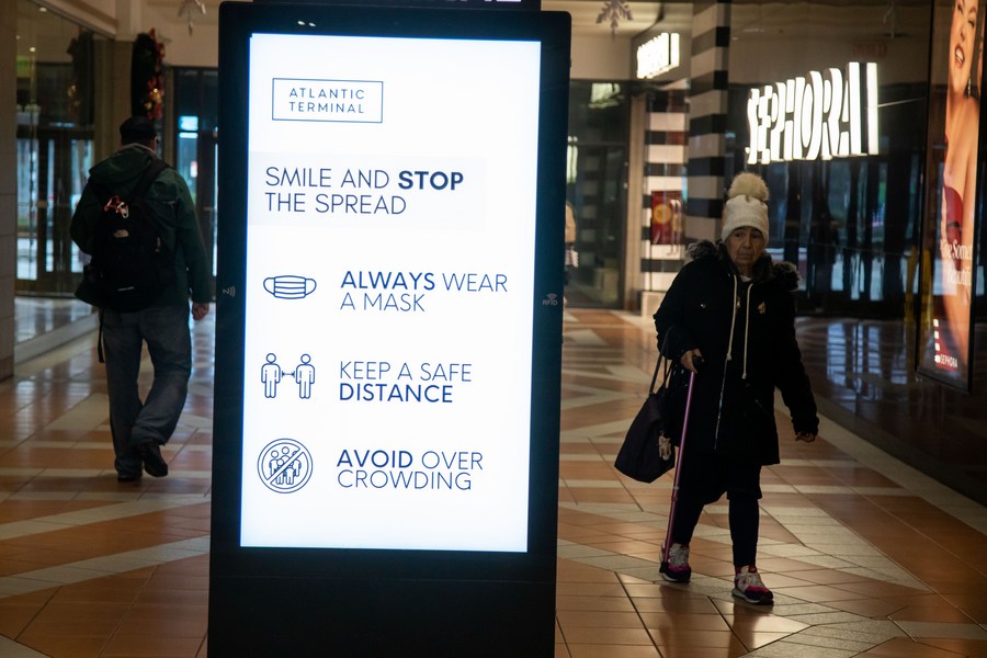 People walk past a sign recommending face masks in a mall in New York, the United States, on Dec. 7, 2022. (Photo by Michael Nagle/Xinhua)