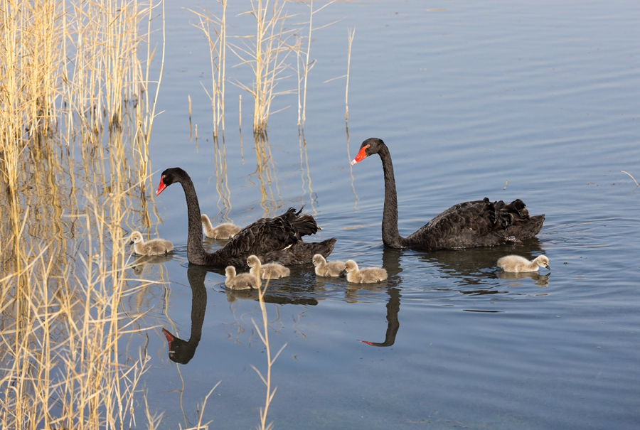 Photo shows a pair of black swans with their seven cygnets in Zhangye National Wetland Park, Zhangye city, northwest China’s Gansu Province. (Photo/Liu Fujun)