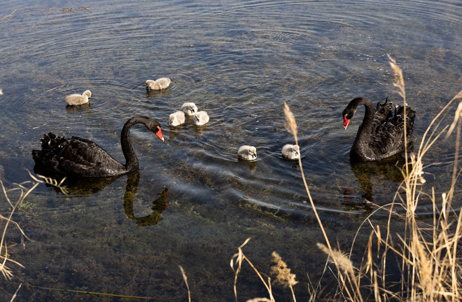 Photo shows a pair of black swans with their seven cygnets in Zhangye National Wetland Park, Zhangye city, northwest China’s Gansu Province. (Photo/Liu Fujun)