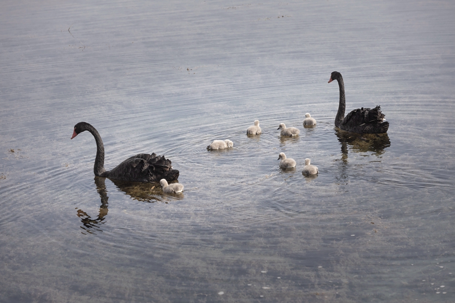 Photo shows a pair of black swans with their seven cygnets in Zhangye National Wetland Park, Zhangye city, northwest China’s Gansu Province. (Photo/Liu Fujun)