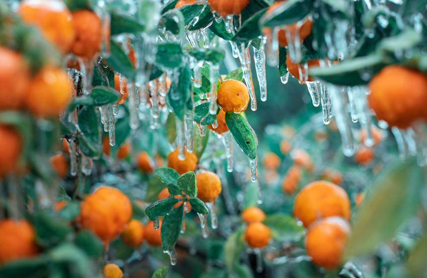 Mandarin oranges are covered in a layer of icicles in Nanfeng county, east China’s Jiangxi Province. (Photo/Xie Weimin)