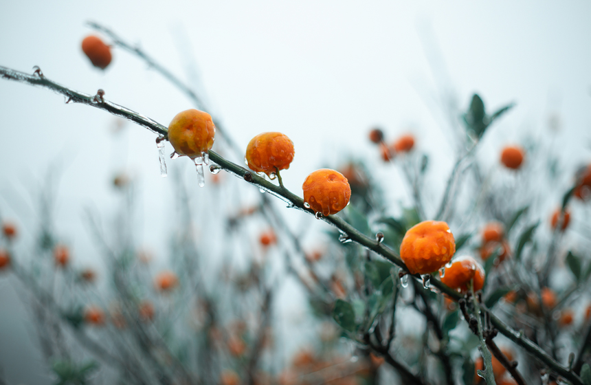 Mandarin oranges are covered in a layer of icicles in Nanfeng county, east China’s Jiangxi Province. (Photo/Xie Weimin)