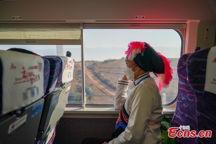 A passenger enjoys the view on a high-speed train in southwest China's Yunnan Province, Dec. 16, 2022. (Photo: China News Service/Liu Ranyang)