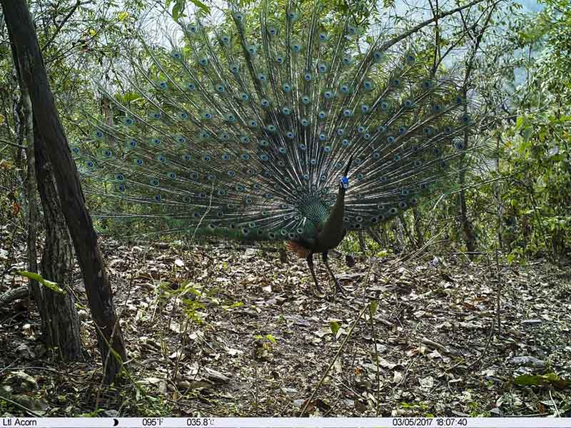 This undated file photo captured by an infrared camera shows a green peafowl in southwest China's Yunnan Province. (Yunnan provincial forestry and grassland bureau/Handout via Xinhua)